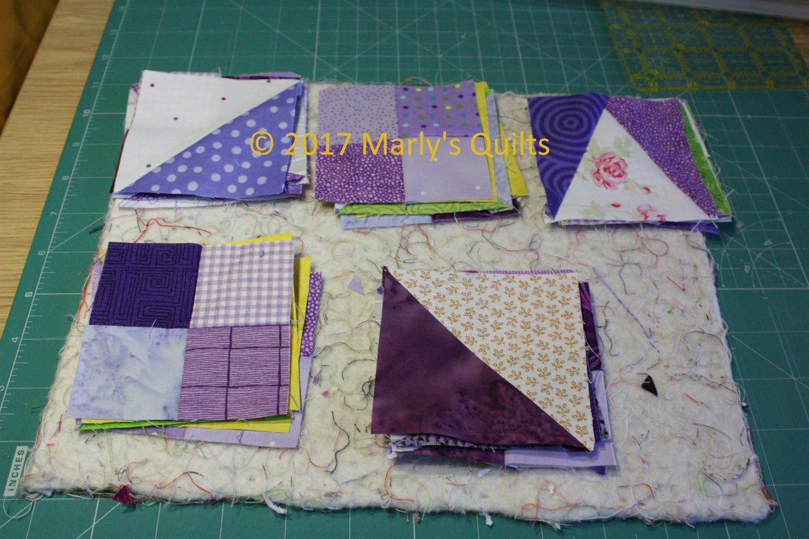 When I join the blocks to make a top I follow Bonnie Hunter's webbing method but I'd like to show how I join the units together in such a large block. In order to avoid inadvertently changing the unit's orientation when walking from design wall to sewing machine I made a couple of design boards from a piece of wadding stapled onto the side of a cardboard box (I didn't have to drink the wine first!).